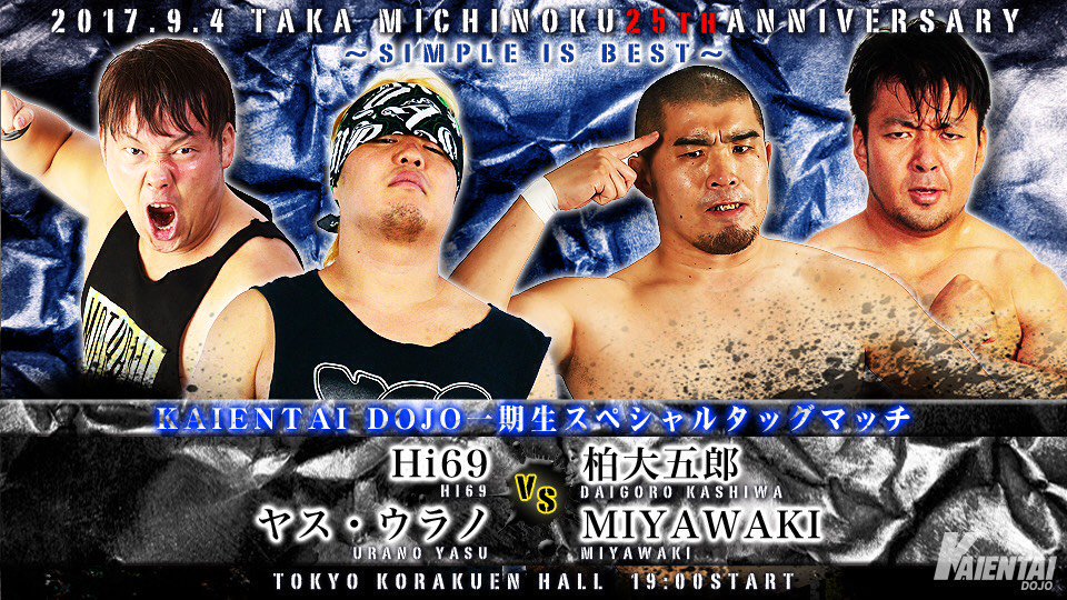 9/4 TAKAみちのく25周年 後楽園ホール 19:00開... 2017年06月30日 カテゴリ:MIYAWAKI 9/4 TAKAみちのく25周年 後楽園ホール 19:00開始 Hi69、ヤス・ウラノ対MIYAWAKI、柏大五郎 KAIENTAI DOJO一期生タッグマッチ。 チケットはdeathpenalty 13@gmail.comまで https://t.co/OexRg1fXKv