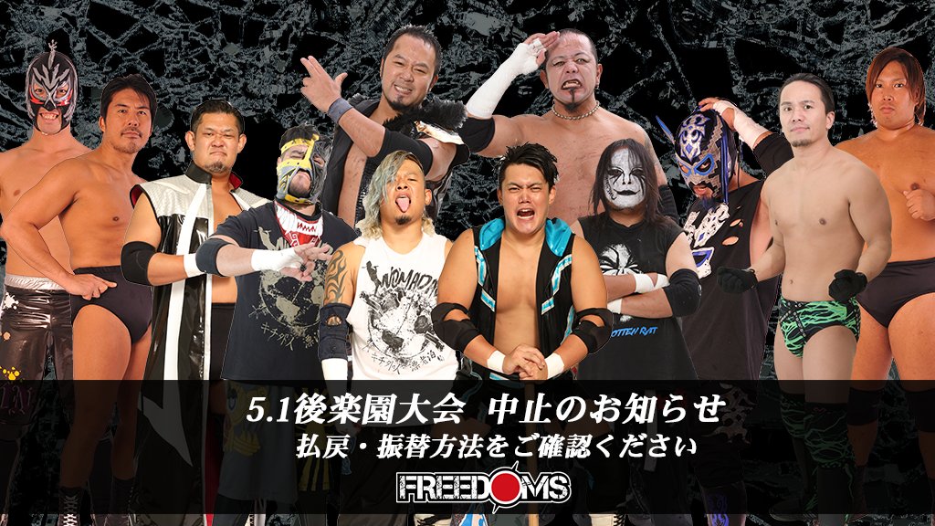 【明日の後楽園ホール大会は中止です】 行政より外出自粛が要請... 2020年04月30日 カテゴリ:プロレスリングFREEDOMS 【明日の後楽園ホール大会は中止です】 行政より外出自粛が要請されている状況を考慮しまして、当日会場での振替、払戻の対応は控えさせていただきます 5月1日後楽園ホール大会中止に伴う、払戻・振替のお知らせはこちらをご確認ください https://t.co/m9JbaZMg11 #pw_freedoms https://t.co/lF6R8Rzis2