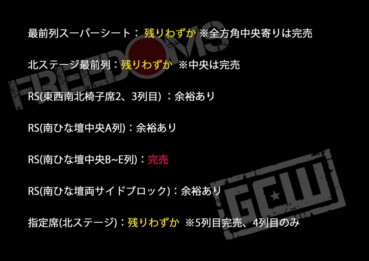 【前売りチケット情報】 7.20 新木場1stRING 『葛... 2023年06月23日 カテゴリ:プロレスリングFREEDOMS 【前売りチケット情報】 7.20 新木場1stRING 『葛西純プロデュース興行 新木場デスマッチカーニバル 2023』 GCW勢参戦予定大会! 本日の会場先行販売にて完売、または残りわずかとなりました席種もございます 6月23日午前10時より公式HPにて一般販売開始いたします #pw_freedoms https://t.co/4OlSEkz1Fo 「プロレスリングFREEDOMS」カテゴリの最新記事 コメントする コメントフォーム 名前 コメント 評価する リセット リセット 顔 星 投稿する 情報を記憶