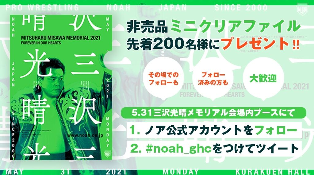 / 📣5.31 #三沢光晴メモリアル にTwitter特設ブ... 2021年05月28日 カテゴリ:プロレスリング・ノア / 📣5.31 #三沢光晴メモリアル にTwitter特設ブースを設置✨✨ \ 【大会】 5月31日(月) 後楽園ホール大会 【特典条件】 下記ツイートいただいた方に特別特典を先着200名様へプレゼント! 1⃣@noah_ghc をフォロー 2⃣大会当日、#noah_ghc をつけてツイート 3⃣ツイート画面を受付にご提示 #noah_ghc https://t.co/ETBXyrWwDg