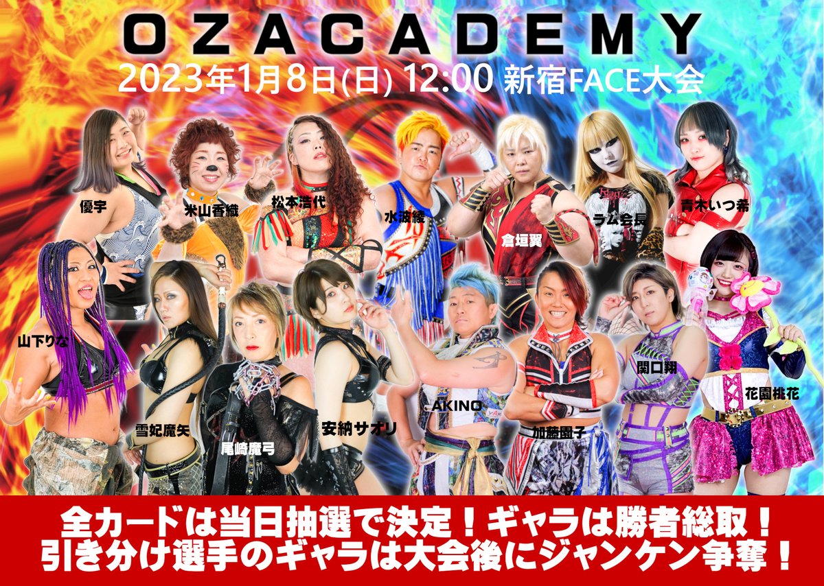 1月8日新宿の開幕戦は全試合が当日抽選、さらに勝者が敗者のギ... 2023年01月03日 カテゴリ:OZアカデミー女子プロレス・オフィシャル 1月8日新宿の開幕戦は全試合が当日抽選、さらに勝者が敗者のギャラをゲット!引き分け試合のギャラは全試合終了後に勝者だけでジャンケン、勝った選手が総取りという壮絶バトルとなります!さらに2022年のMVP&ベストバウトの発表もあり盛りだくさん!チケットは絶賛発売中! https://t.co/HJdGRzEiOJ https://t.co/f7R6OkRAdu